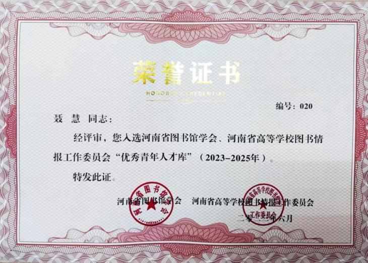 近期,河南省图书馆学会、河南省高等学校图书情报工作委员会联合组织了“河南省图书馆界优秀青年学者”选拔工作。经过遴选推荐和专家组评审,我校图书馆聂慧老师入选河南省图书馆学会、河南省高等学校图书情报工作委员会“优秀青年人才库”。