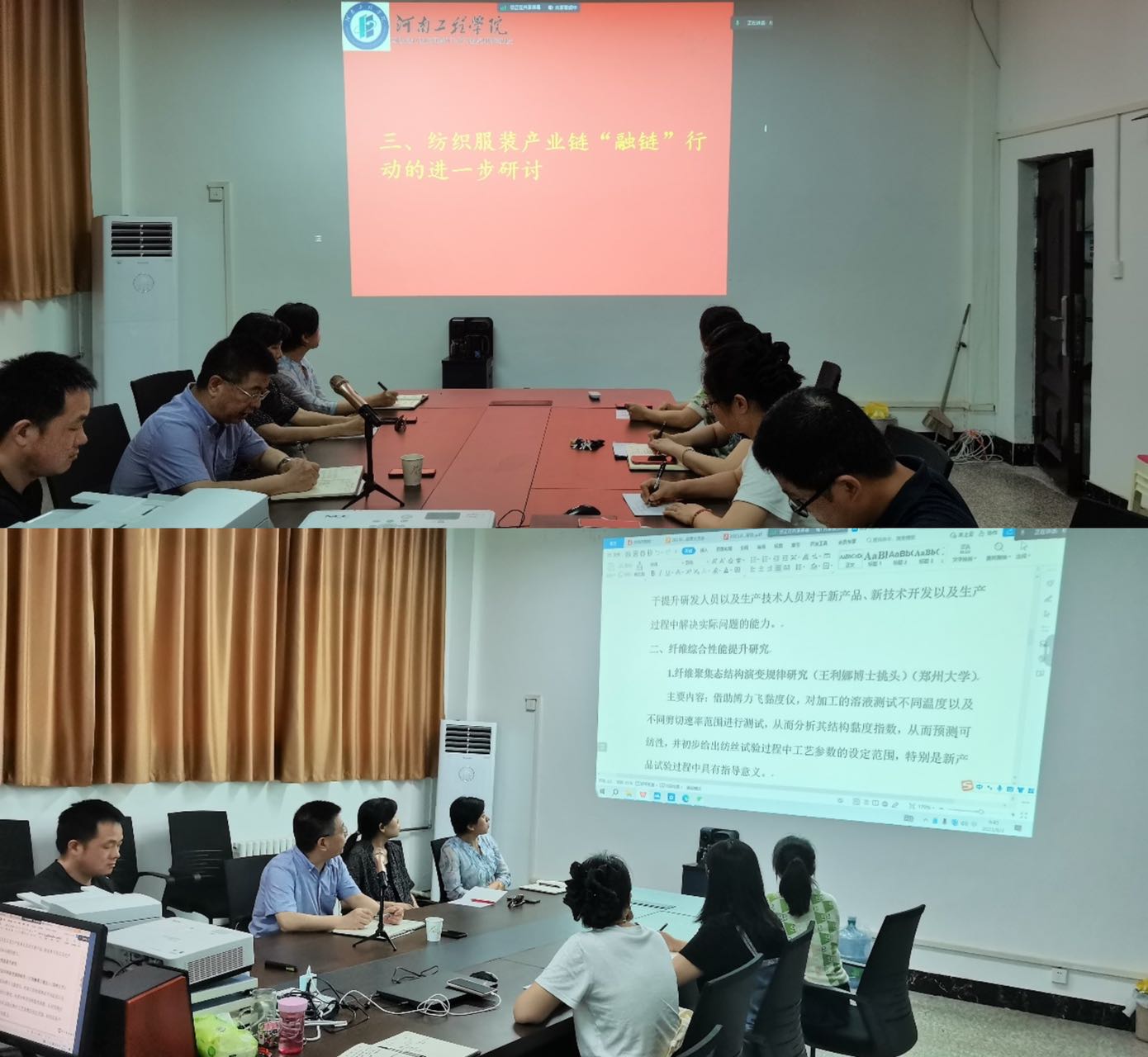 首先,辛长征介绍了《河南省培育壮大纺织服装产业链行动方案(2023—2025年)》和《河南工程学院对接河南现代产业体系重点产业链“融链”行动方案(2023—2025年)》的情况,并强调了“融链”行动对促进学院各专业尤其是高分子材料与工程专业建设发展的重要性。然后,杨柳和刘少辉分别从教学方面和科研方面介绍了与产业链盟会长单位-新乡化纤股份有限公司的对接联系情况,找准纺织服装产业链中的结合点,加紧深入开展合作。最后,通过紧密结合专业教师的科研领域,会议讨论通过了《河南工程学院材料工程学院与新乡化纤股份有限公司拟合作事宜方案》,从技术人员培训、纤维综合性能提升研究、聚氨酯弹性纤维的功能改性、纤维素长丝方面的研究等四个方面深入细化合作,为“融链”行动的下一步规划指明了方向。