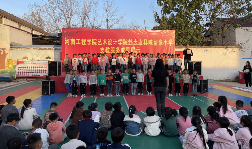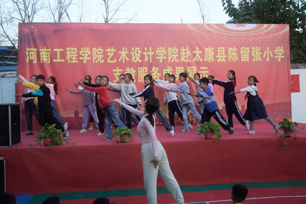 在支教活动尾声,学院师生团队的授课成果进行了展示,搭建了一个“河南工程学院艺术设计学院对赴太康县陈留张小学支教服务成果展示”的舞台,孩子们纷纷在舞台上展示自己快乐的歌声、优美的舞姿和创意的手工作品,让我们共同见证了孩子们的成长与勇敢、童真与自信。