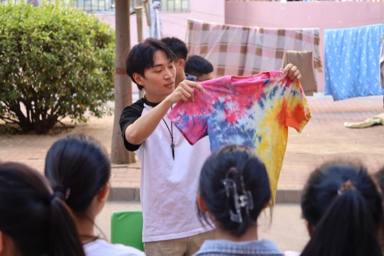 活动伊始,参与的同学们共同学习了扎染的传统知识、扎染工具、流程以及不同的配色技巧,让同学们对扎染技艺有了更加深入的理解和认识。在实际操作环节,同学们大展身手,充分发挥自己的想象力,融入自己的想法和情感,对手中的纯白布料进行设计、染色,创作出属于自己的独一无二的艺术品。活动中,育人导师向大家分享了色彩在情感和心理状态中扮演着重要的角色,引发热烈的讨论和思考。