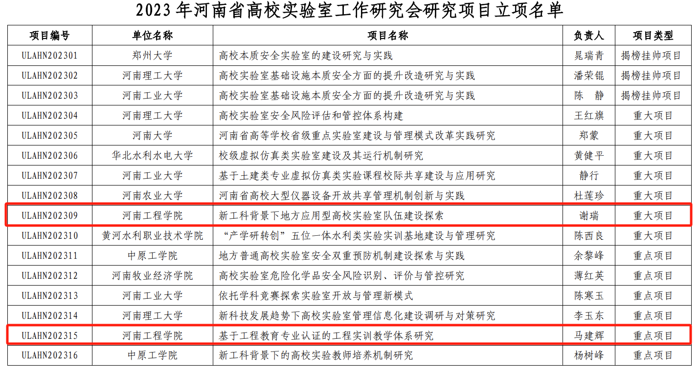 近日,河南省高校实验室工作研究会公布了“2023年河南省高校实验室工作研究会研究项目”立项名单,我校喜获重大项目一项、重点项目一项。