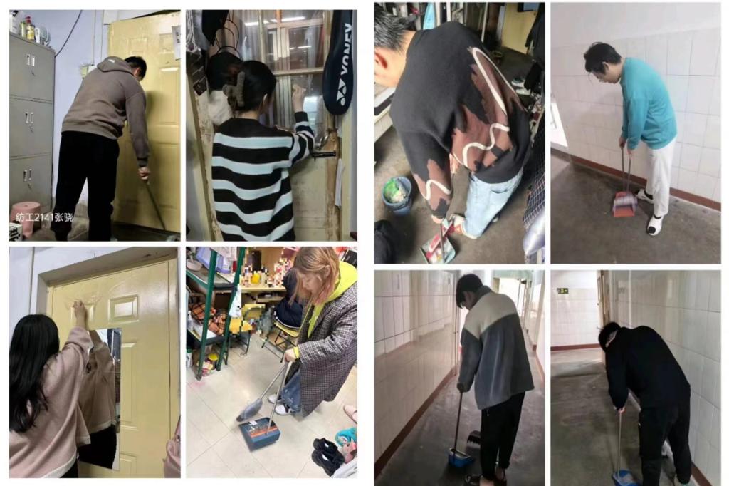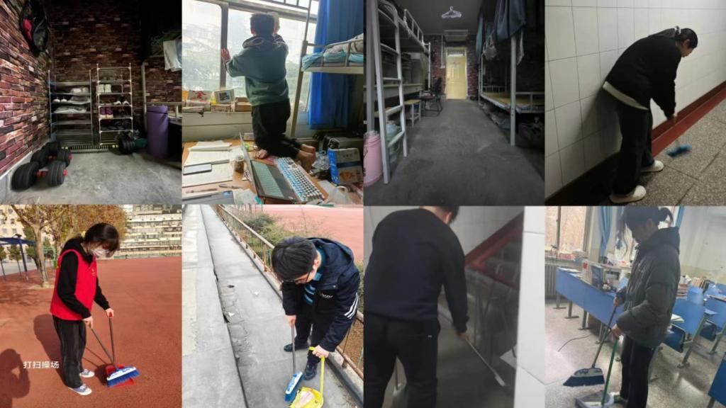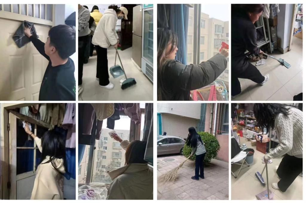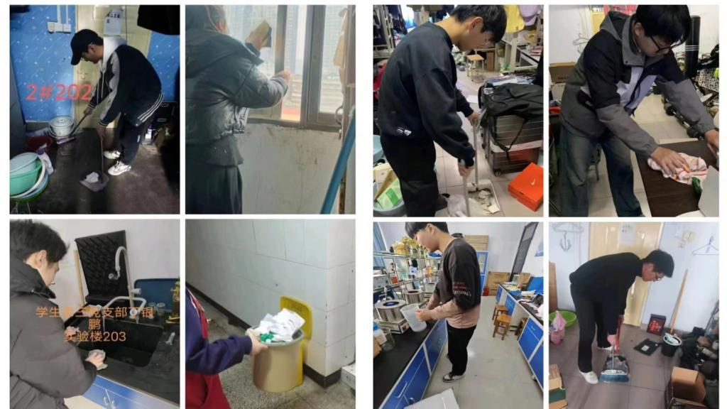 学生党员们义务清扫学校院落、操场、宿舍走廊、教室、实验室,擦拭宿舍窗玻璃、电扇、窗台、门等公共设施,发挥模范带头作用,整理、规范摆放个人物品,收纳、集中放置楼道中的物品,以确保宿舍楼逃生通道畅通,整理内务、洁净个人生活区,在清洁卫生方面为其他同学做表率,也为其他同学营造清洁、整齐、美观的日常生活环境。还有部分党员走出校园、走进社区,开展公共区域志愿清扫工作或为孤寡老人打扫卫生。