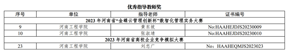 据悉,此次共公布由河南省高等教育学会举办的2023年河南省大学生会计大赛等10项赛事成绩。在“金蝶云管理创新杯数字化管理实务大赛”中,会计学院获得一等奖1项,三等奖1项,黄东坡和张淑靖获得优秀指导教师奖。在“本科院校税收风险管控案例大赛”中,会计学院获得二等奖1项,三等奖1项;在“会计技能竞赛”中,会计学院获得三等奖2项;在“大学生审计技能大赛”中,会计学院获得三等奖1项。“高校企业竞争模拟大赛”中,商学院获得二等奖2项,三等奖1项。刘忠广获得优秀指导教师奖。在“人力资源数据分析大赛”中,商学院获得三等奖3项。在“高校商业精英创新创业挑战赛”中,会计学院获得一等奖1项,商学院获得二等奖1项。