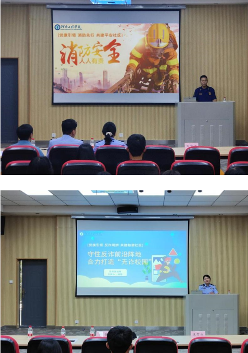 讲座中,连贺方队长通过真实的案例,结合图片和视频资料,理论联系实际,深入浅出地讲解了消防安全的重要性。他全面介绍了在日常的工作、学习和生活中应注意的消防安全细节,如何扑救初期火灾以及火灾中如何自救、逃生等知识,并对消防器材的正确使用做了细致讲解。姚静警官用通俗易懂的语言和具体案例,从诈骗案件的新特点、高发原因以及典型诈骗类型等方面进行细致全面讲解,并就面对电信诈骗如何紧急应对,给大家做出反诈提醒,引导大家增强防范意识。