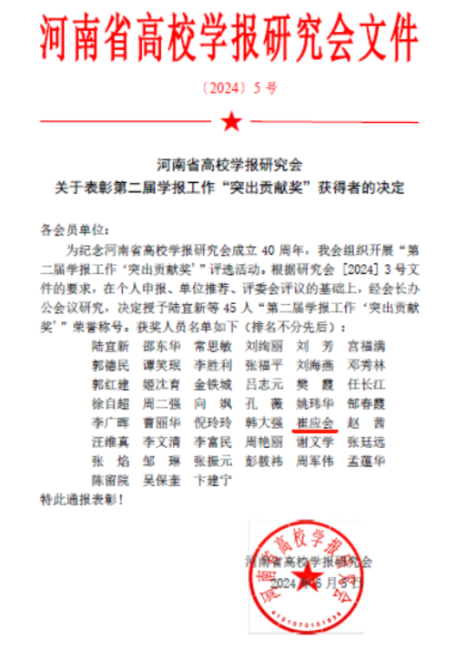 近日,河南省高校学报研究会表彰了一批在学报工作中做出杰出贡献的先进个人。其中,我校学报编辑部教师崔应会荣获第二届学报工作“突出贡献奖”,这一荣誉是对崔应会老师多年来为我校学报辛勤耕耘和无私奉献的充分肯定。崔应会老师自加入我校学报编辑部以来,一直以其深厚的学术素养、严谨的工作态度和高度的责任心,为我校学报的编辑、出版和策划工作作出了巨大贡献。在编辑工作中,她始终坚守学术诚信,严格把控稿件质量,对稿件进行精心筛选和打磨。在出版和策划方面,崔应会老师不断创新思路,拓宽视野,为我校学报注入了新的活力和生机。
