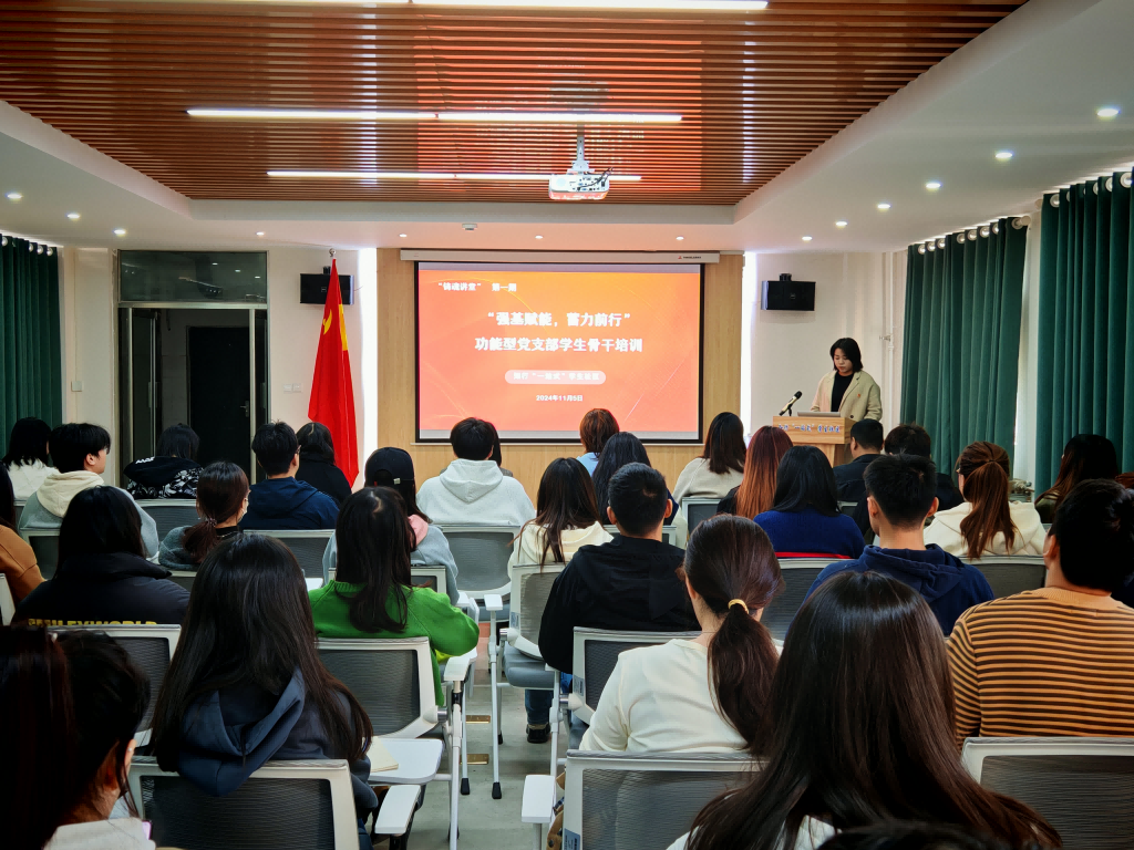 为充分发挥“一站式”学生社区功能型党支部作用,不断提升学生党员这一“关键少数”的思想政治素质、服务引领意识、实践创新能力、组织协调能力,11月5日,知行“一站式”学生社区在“知行·初心讲演厅”举办了“铸魂讲堂”第一期——2024年下半年功能型党支部学生骨干培训大会。知行社区主任方月、综合办副主任刘歌、社区育人导师出席,全体功能型党支部骨干参加培训。本次培训由社区学生服务中心副主任史柳主持。