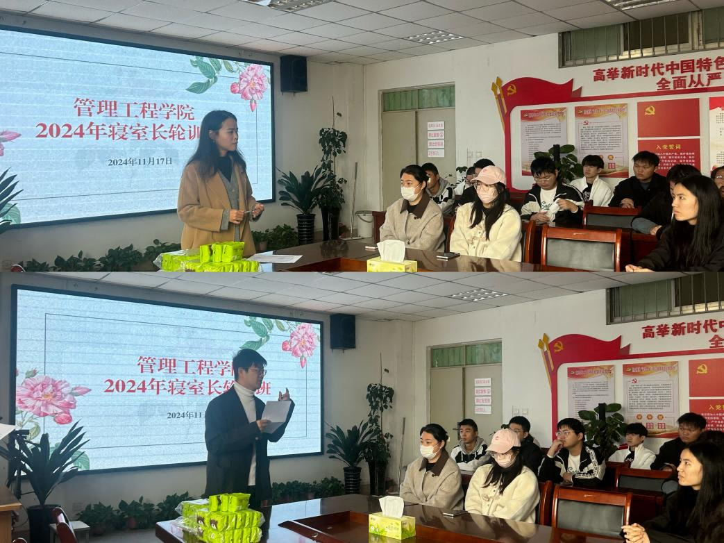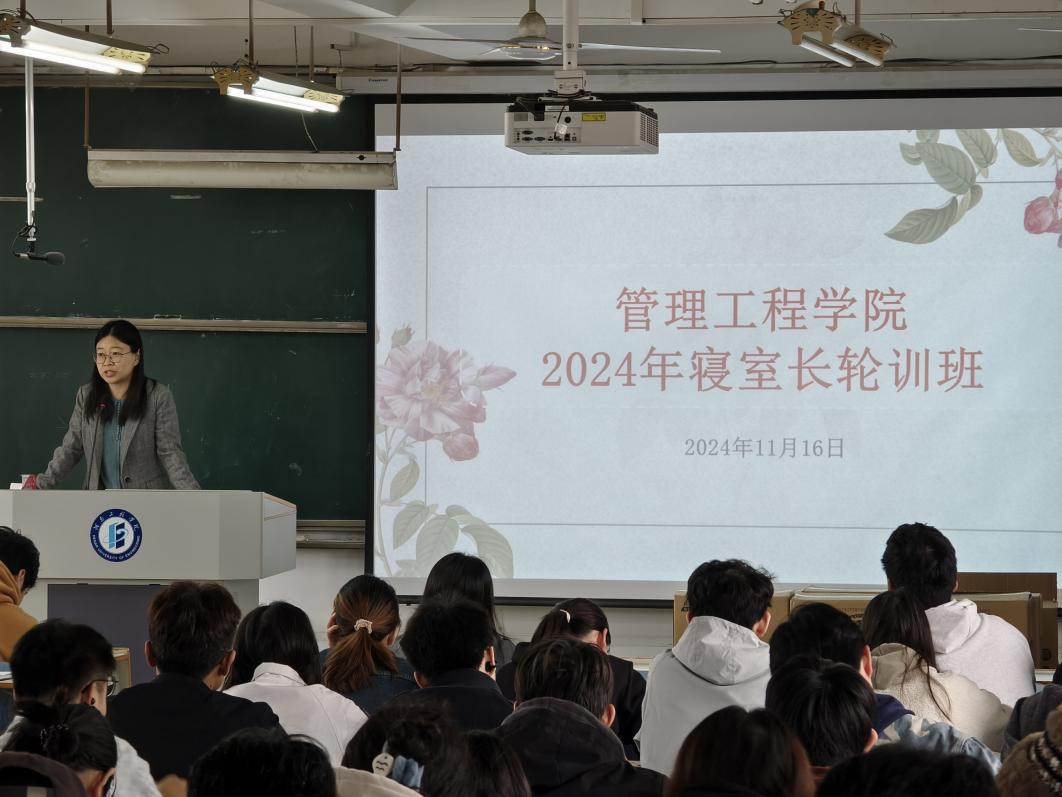为进一步落实学校《关于加强班长、寝室长队伍建设的实施意见》要求,强化班级宿舍管理,充分发挥基层学生干部在管理育人、校园稳定、自我服务、示范带动等方面作用。11月16日至17日,管理工程学院举办2024年寝室长轮训班,学院党委副书记曹冰、全体辅导员,知行“一站式”学生社区辅导员李新彦和全体寝室长共计175人参加了此次轮训。轮训由李飞主持。