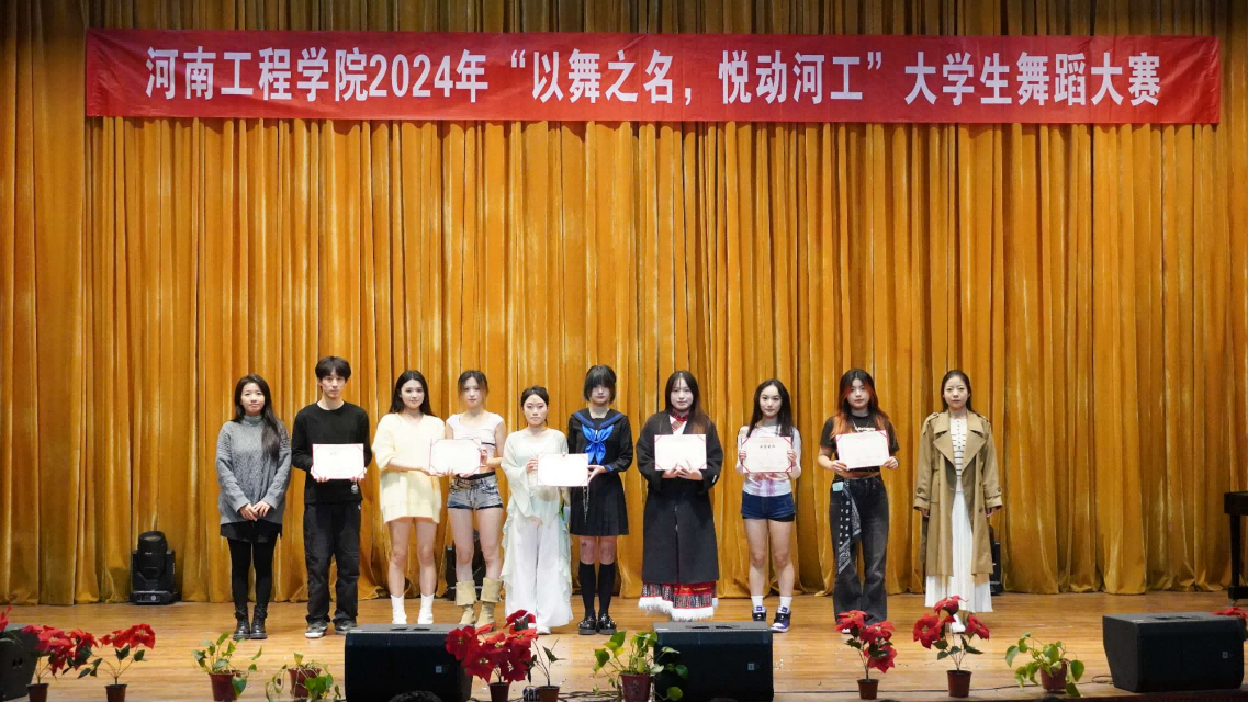 大赛由河南工程学院主办,党委宣传部、校团委及公共艺术教育中心联合承办,吸引了全校学生的踊跃参与,现场座无虚席。本次大赛主题鲜明,鼓励学生以舞蹈为媒介,展现青春风采、表达对生活的热爱与对美的追求。参赛作品形式丰富,涵盖独舞、双人舞、三人舞及群舞等。其中,3 号选手带来的宅舞《Love》活力四射,瞬间点燃现场气氛;6 号、10 号和 12 号分别表演的中国舞《傣女》《山鬼》《流水桃花》,舞姿优雅柔美,尽显中国舞的独特韵味;9 号的独舞《冬日》别出心裁,亮片如雪花般缓缓飘落,营造出冬日的氛围;三人舞《Champion!》以幽默滑稽的动作,引得观众时而哄笑、时而惊叹。选手们带来的每一支舞蹈都充分彰显了青年学子的独特魅力与无限创意,他们用肢体动作向观众传达着自由与快乐。