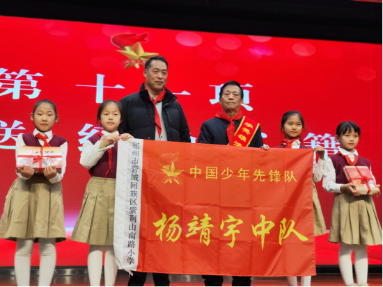 管城区教育局总辅导员辛哲宣读《关于创建“杨靖宇中队”的批复》;我校团委书记许卫华为杨靖宇中队授旗;紫荆山南路小学党总支书记石全中为“杨靖宇中队”聘请校外辅导员并颁发聘书,我校艺术设计学院教师马新全受聘;我校靖宇宣讲团、紫荆山南路小学“靖宇寻访团”携手汇报红领巾追寻“靖宇”足迹,传承红色基因社会实践成果;第七届全国少工委委员、首批全国少先队名师工作室带头人皇甫鸿昌举行了现场思政教学——少先队思政课“永远的红领巾”,向少先队员们讲述了“英雄中队”的故事,并向“杨靖宇中队”赠送红色书籍。