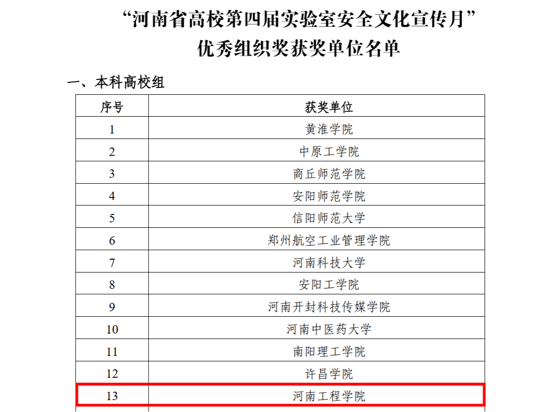河南省高校实验室安全文化宣传月是由河南省教育厅发起、河南省高校实验室工作研究会主办、河南省高校共同参与的年度实验室安全文化宣传教育活动,旨在贯彻落实习近平总书记关于安全生产的重要论述,树立以师生为中心的安全发展观,努力营造和谐稳定的校园环境。今后,我校将持续推动实验室安全文化建设,不断增强师生安全意识,提高实验室动态化、智能化、信息化的安全防护与应急处突能力,全面筑牢实验室安全防线,为学校高质量内涵式发展和高水平应用型大学建设提供坚强保障。