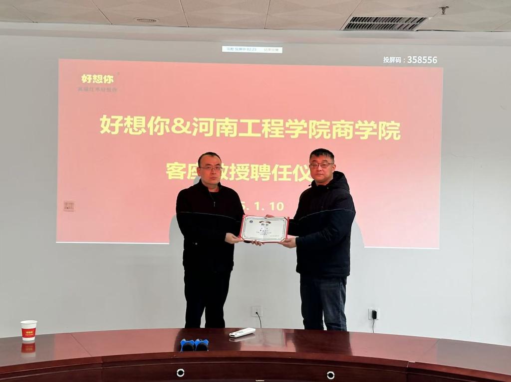 客座教授受聘仪式上,好想你公司物流和信息化负责人张磊受聘为商学院客座教授。张磊表示将定期走进校园,为学生们带来最前沿的行业动态和实践经验分享,进一步丰富商学院的教学资源,拓宽学生的视野。同时,强调将全力支持实习实践基地的建设和运行,为学生提供良好的实习条件和指导,也希望能够吸引更多优秀人才加入企业,推动企业的创新发展。