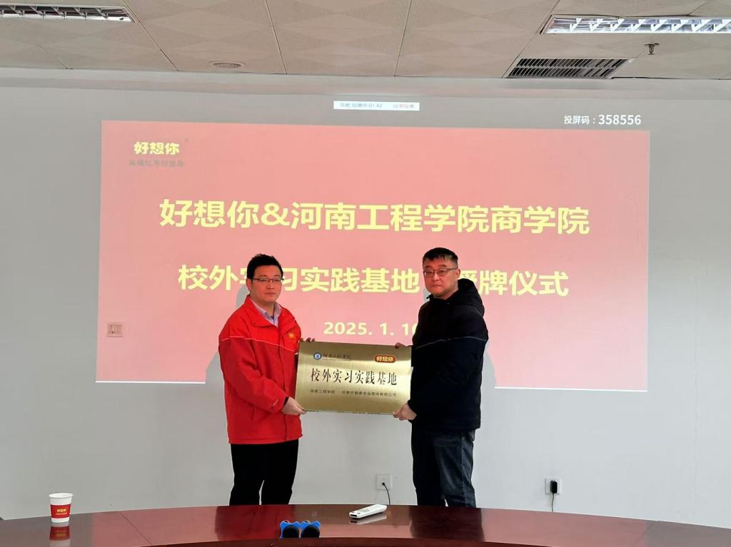 校外实习实践基地授牌仪式上,田正军郑重地将“校外实习实践基地”牌匾授予好想你公司,这标志着双方在人才培养方面的合作迈出了坚实的一步。该实习实践基地将为商学院的学生提供丰富的实习机会和实践项目,让学生们能够在真实的工作环境中锻炼自己,提升专业技能和综合素质。