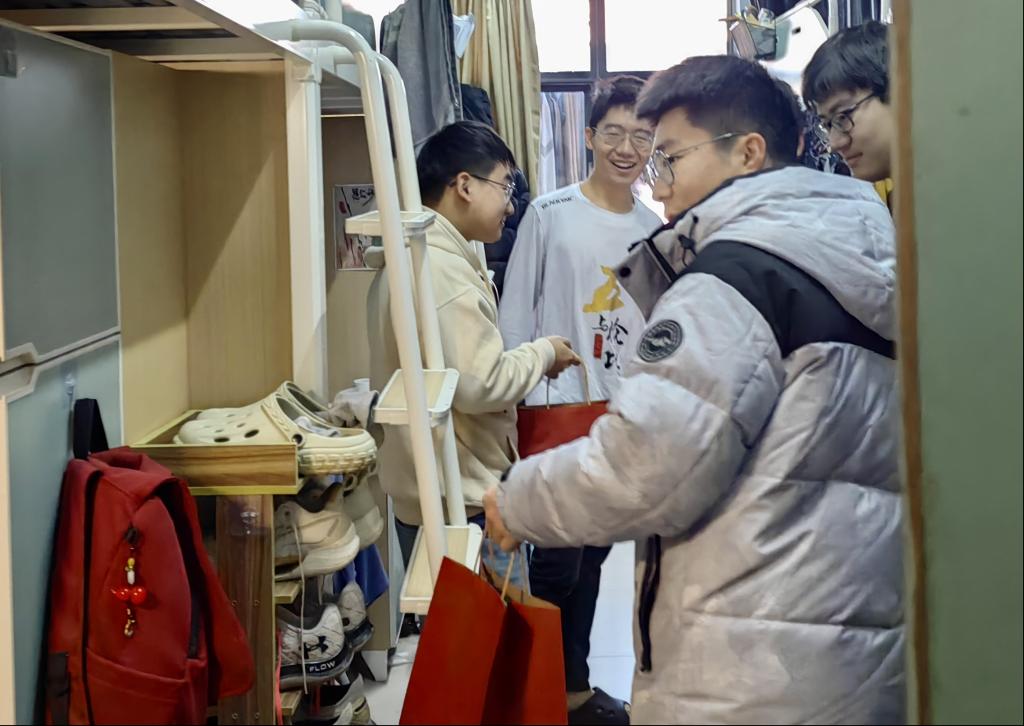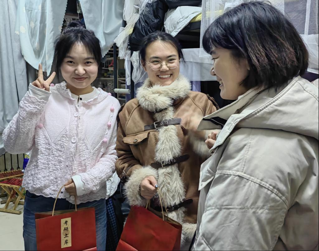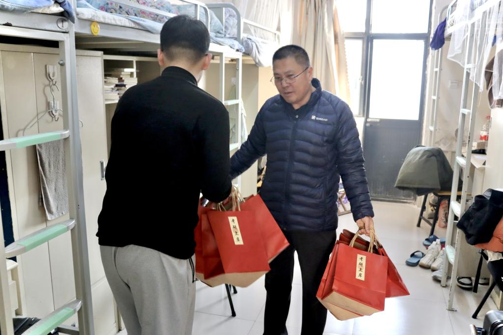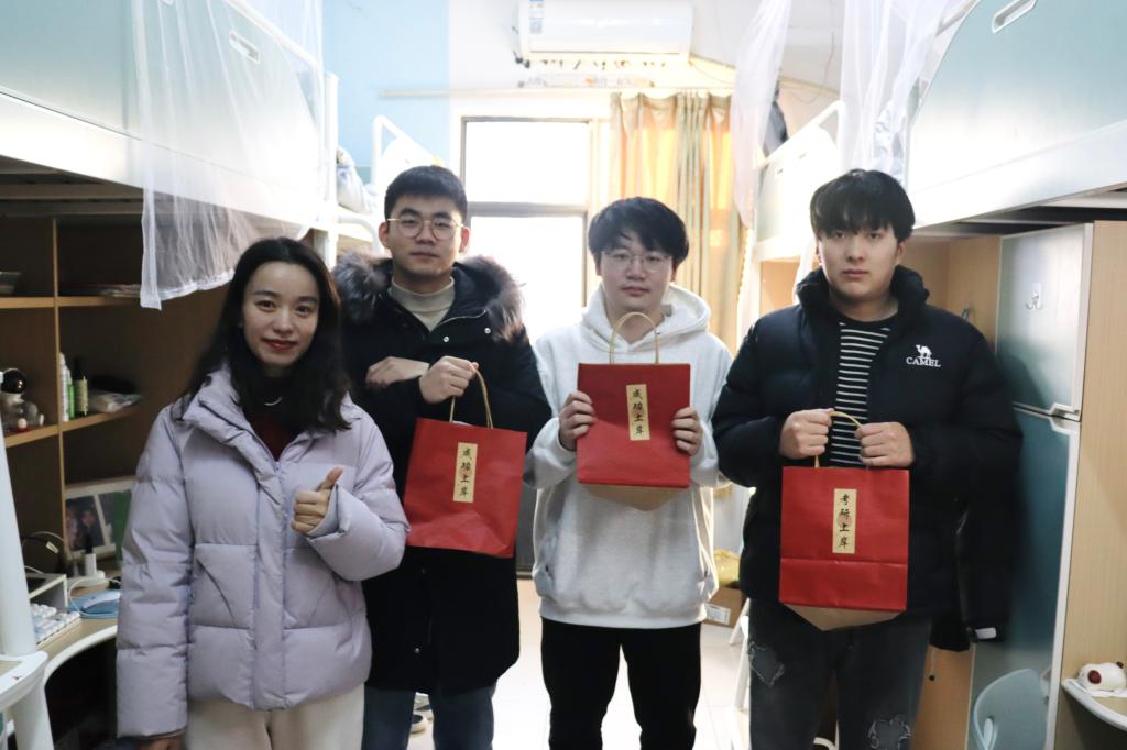 王建友考研学子面对面交流,心连心关怀,悉心叮嘱同学们在备考过程中要注意调节情绪,避免过度紧张和身心疲惫,保持积极乐观的心态,以饱满的精神状态迎最后的挑战张娜鼓励同学们要顶住压力、全力冲刺、一战上岸,遇到问题困惑可以随时找老师们沟通,学院永远是同学们坚实的后盾。学院老师及学弟学妹还为考研学子们亲手准备了“考研大礼包”,其中包括寓意美好的橙子预祝同学们能够一战“橙”硕精美的考试文具,为同学们考试保驾护航;温馨的祝福贺卡,虽身处寒冬但句句温暖人心。