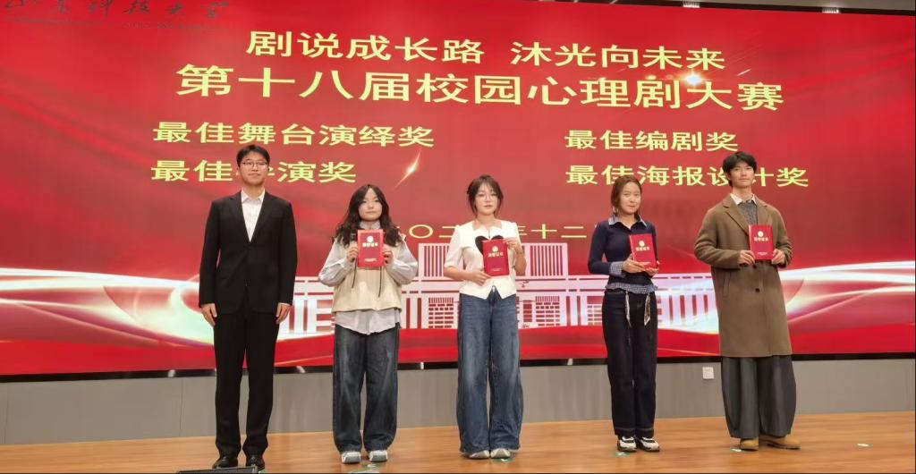点击:12月7日“剧说成长路,沐光向未来”山东科技大学第十八届校园心理剧大赛在图书信息中心求新讲堂圆满落幕。安全学院安全工程2025-1班参赛作品《苹果滚落的瞬间》以真挚的情感表达和深刻的心理内涵脱颖而出,取得了一等奖的优异成绩,尹旭获得最佳男主角奖,邓中鑫获得最佳男配角奖,房真羽获得最佳编剧奖。