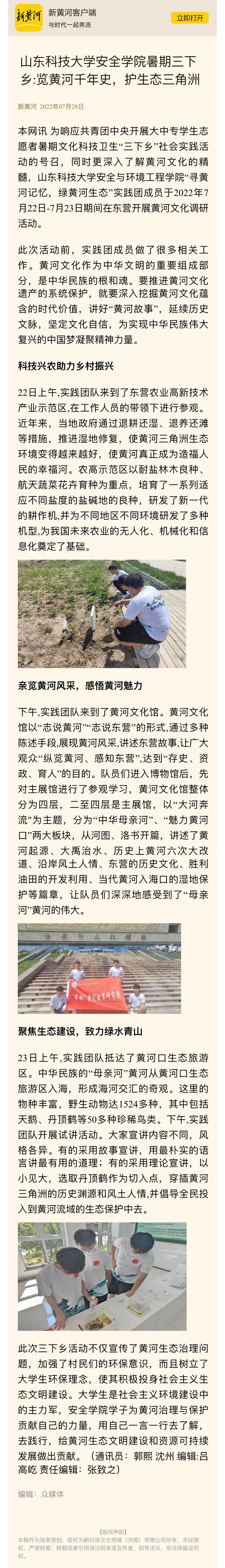 山东科技大学安全学院暑期三下乡:览黄河千年史,护生态三角洲
