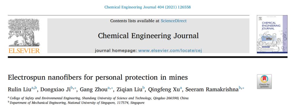 点击:近日,我院周刚教授课题组与新加坡国立大学Seeram Ramakrishna教授课题组在材料、化学类顶刊《Chemical Engineering Journal》(中科院1区TOP期刊、IF=10.652)合作发表了题为“Electrospun nanofibers for personal protection in mines”的论文。我校为第一通讯单位,周刚教授为通讯作者,2019级博士柳茹林为论文第一作者。这是我院教师首次与国际顶尖团队合作发表高水平学术论文。