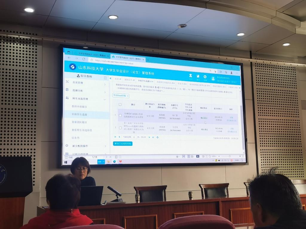 陈海燕老师首先带领老师们学习了去年下发的《关于做好 2021届本科毕业生毕业设计(论文)相关工作的通知》和《山东科技大学本科生毕业设计(论文)工作管理规定》,梳理了毕业设计(论文)需要提交的所有材料,对文件要点进行了解读。随后陈老师在毕业设计(论文)管理系统中针对每一个功能进行了详细的讲解,就登陆方法、上传过程材料、时间节点等方面提供了许多建议。安全工程系杨文宇老师也提到指导教师一定要注意答辩成绩提交的时间节点。