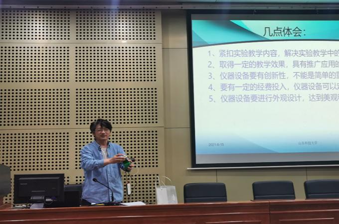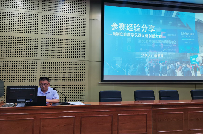 会上,首先由前不久刚获得第六届全国高等学校教师自制实验教学仪器设备创新大赛三等奖的肖新峰和薛建良两位老师分享了参赛过程的经验和感想。肖老师详细介绍了自制仪器的过程以及仪器在教学过程中发挥的作用。在谈及参赛体会时,他认为仪器要紧扣实验教学内容,解决实验教学中的实际问题,特别是肖老师分享的设计在线加热装置的过程,充分体现了肖老师对工作高度负责、对学生认真辅导的师德作风。薛老师详细介绍了本次大赛的背景、流程、提交的材料等内容,并分享了自己的收获,制作仪器过程中特别注重师生互动和生生互动,激发了学生的创新精神,促进学生全面发展,是关心学生成长的师德体现。