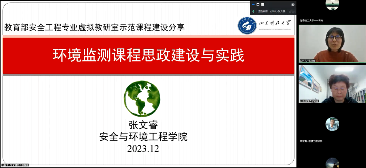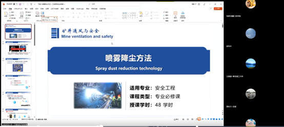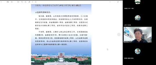 会上,山东科技大学张文睿副教授以环境监测课程思政建设与实践为题,从基本情况、课程设计、实施方案以及评价成效四个方面介绍了思政课程的建设思路与成功经验;于海明副教授结合自身青年教师讲课比赛经历,进行了矿井通风与安全示范课程的展示与讲解。本次活动吸引了来自新疆工程学院、黑龙江科技大学以及辽宁工程技术大学等虚拟教研室12所共建单位的70余位专家、老师参与。青岛科技大学的程家骥副教授、河南理工大学的王云刚副教授、贵州大学的韦善阳副教授高度赞扬了示范课程讲授内容和沙龙活动举办形式。