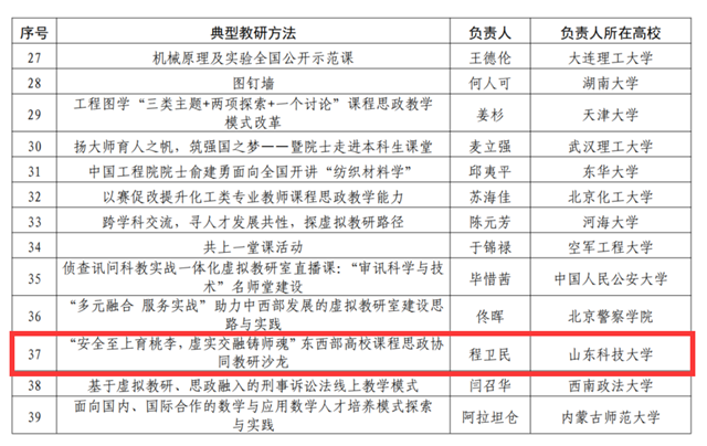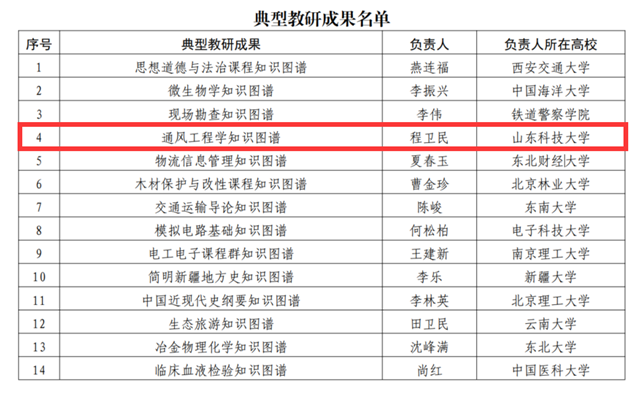 点击:近日,虚拟教研室建设专家组发布了《关于发布虚拟教研室试点建设典型名单的通知》,我校程卫民教授作为负责人的教育部安全工程专业虚拟教研室教研成果入选典型教研成果。其中,我校与新疆工程学院联合举办的“安全至上育桃李,虚实交融铸师魂”东西部高校课程思政协同教研沙龙入选典型教研方法;程卫民教授作为负责人建立的通风工程学知识图谱入选典型教研成果。