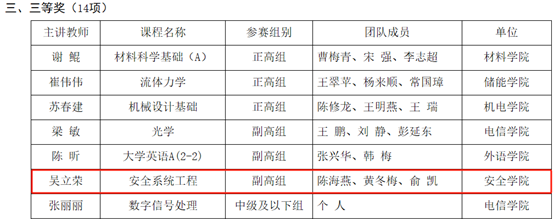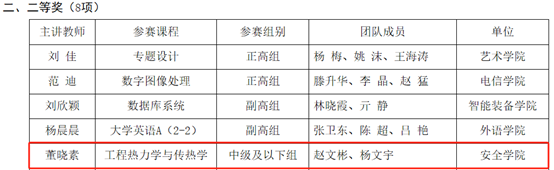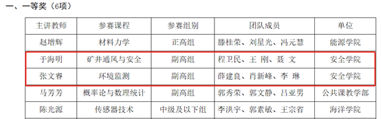 点击:近日,山东科技大学第四届教师教学创新大赛圆满落幕。经过激烈角逐,学院于海明老师团队主讲的《矿井通风与安全》荣获新工科赛道副高组一等奖、张文睿老师团队主讲的《环境监测》荣获课程思政赛道副高组一等奖、董晓素老师团队主讲的《工程热力学与传热学》荣获新工科赛道中级及以下组二等奖、吴立荣老师团队主讲的《安全系统工程》荣获课程思政赛道副高组三等奖。