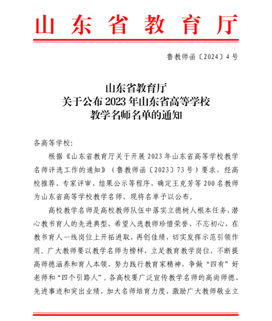 点击:日前,山东省教育厅公布2023 年山东省高等学校教学名师名单,我院刘音教授成功入选。