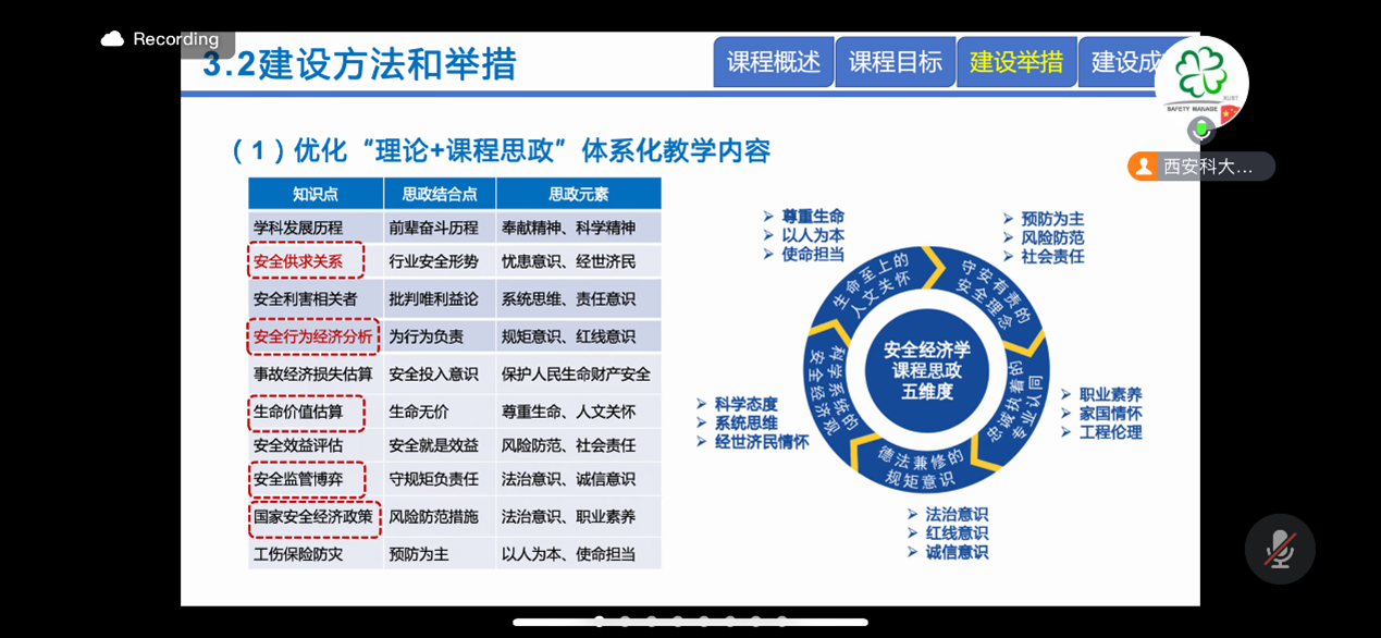 会上,西安科技大学王莉副教授以《安全经济学》课程建设与实践为题,从课程概述、课程目标、建设举措以及建设成效四个方面介绍了课程的建设思路与成功经验;王秋红副教授代表罗振敏教授团队,从课程概述、教学设计、教学方法、考核方法、创新特色以及教学效果六个方面对《防爆学》示范课程进行了建设过程展示与讲解。本次活动吸引了来自西安科技大学、山东科技大学、河南理工大学、新疆工程学院、黑龙江科技大学以及辽宁工程技术大学等虚拟教研室12所共建单位的80余位专家、老师参与。