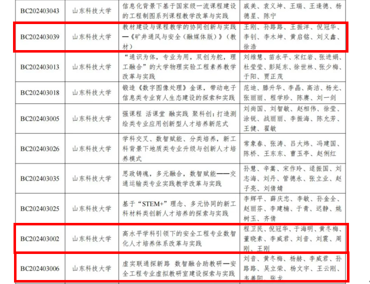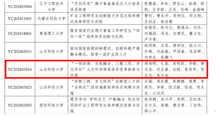 点击:近日,中国煤炭教育协会公布了2024年全国煤炭行业教学成果获奖项目,我院获2024年全国煤炭行业本科教学成果一等奖3项,二等奖1项,研究生教学成果一等奖1项,二等奖2项的好成绩。其中程卫民教授团队的《高水平学科引领下的安全工程专业数智化人才培养体系改革与实践》、王刚教授团队的《教材建设与课程教学的协同创新与实践—<矿井通风与安全(融媒体版)>(教材)》、和刘音教授团队的《虚实联通探新路,数智融合助教研-安全工程专业虚拟教研室建设探索与实践》获得本科教学成果一等奖。刘震教授团队《面向未来、强化实践、赋能安全工程专业“双创”教育新动能》获本科教学成果二等奖。胡相明教授团队的《“一核四维、双轨融合、三醒三思、多元评价”火灾科学课程体系改革探索与实践》获研究生教学成果一等奖,周刚教授团队的《“六轨同项、四链融合”安全科学与工程学科研究生人才培养模式改革与创新》和曹晓强教授团队的《“顶天立地、横纵贯通” ——国家战略牵引下的环境学科研究生培养模式创新与实践》获研究生教学成果二等奖。