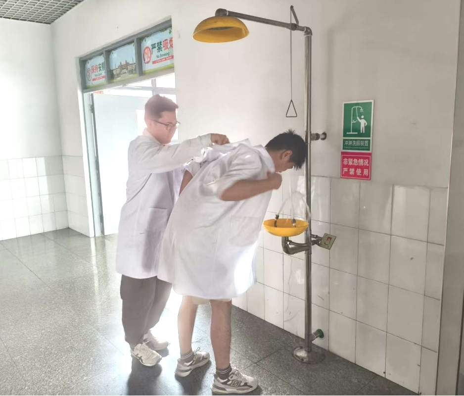参加应急演练的师生根据应急预案逐一开展了浓硫酸泄漏后的人员救护、撤离警戒、事故上报、应急处置、现场评估等突发事件处置全过程。演练结束后,王鹏仔细为师生们讲解了日常实验防护规范、危化品应急处置原则、紧急喷淋和洗眼器的使用及注意事项等。张恩生对本次应急演练给予充分肯定,他指出,安全是一切事业发展的前提和保障。实验室安全对维护正常的教学科研秩序,培养高素质人才起着重要的保障作用。学院将以此次演练为契机,持续加强实验室安全管理工作,做到“人人讲安全、个个会应急”。