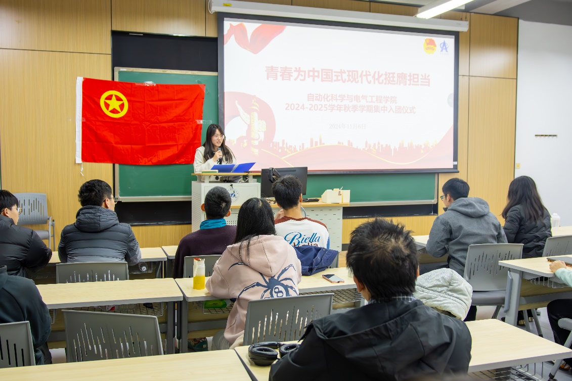 为深入学习贯彻习近平总书记五四重要寄语精神,引导广大团员青年坚定不移听党话、跟党走,11月6日下午,自动化科学与电气工程学院在新主楼D215举办“青春为中国式现代化挺膺担当”2024-2025学年秋季学期集中入团仪式。学院团委书记乔娇,兼职辅导员、思政教育中心指导教师吕子良,学院团委、各团支部新老团员代表30余人参加。仪式由江津同学主持。