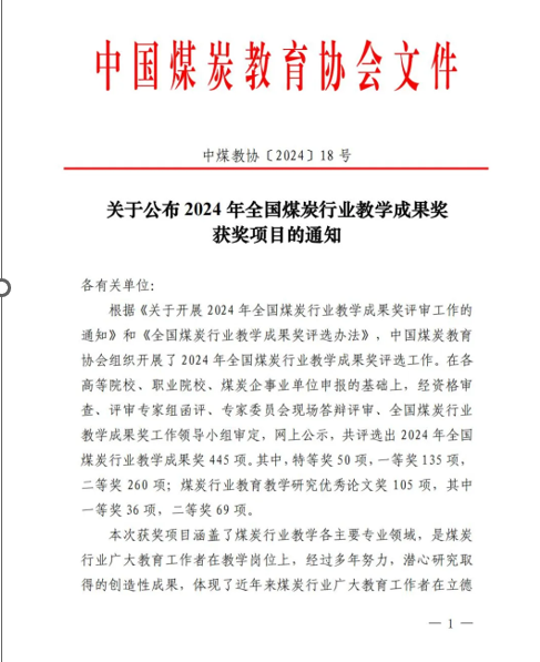 2024-09-23近日,中国煤炭教育协会公布了2024年全国煤炭行业教学成果获奖项目,我院获2024年全国煤炭行业本科教学成果一等奖3项,二等奖1项,研究生教学成果一等奖1项,二等奖2项的好成绩。其中程卫民教授团队的《高水平学科引领下的安全工程专业数智化人才培养体系改革与实践》、王刚教授团队的《教材建设与课程教学的协同创新与实践—<矿井通风与安全(融媒体版)>(教材)》、和刘音教授团队的《虚实联通探新路,数智融合助教研-安全工...