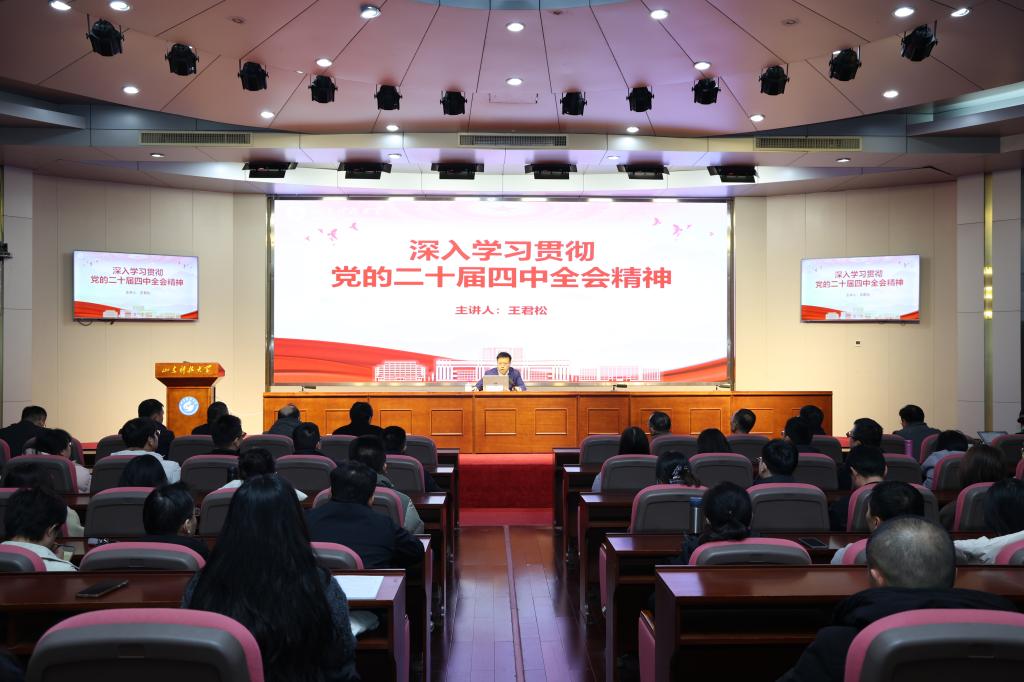 2025-12-09为深入学习宣传贯彻党的二十届四中全会精神,引导干部师生把思想和行动统一到全会精神上来,推动全会精神在校园落地生根、开花结果,12月4日,山东高校宣讲团成员、校党委书记王君松为安全学院师生宣讲党的二十届四中全会精神。王君松围绕党的二十届四中全会整体情况、准确把握“十五五”时期在基本实现社会主义现代化进程中的重要地位、深刻领会“十五五”时期经济社会发展的指导方针和主要目标、全面理解“十五五”时期经济社...