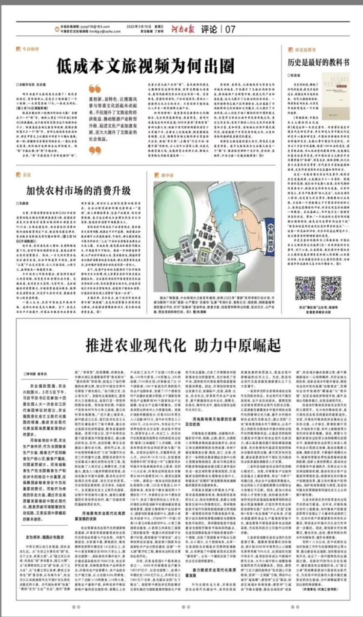 习近平总书记在参加十四届全国人大一次会议江苏代表团审议时强调:“农业强国是社会主义现代化强国的根基,推进农业现代化是实现高质量发展的必然要求。”为深入贯彻落实习近平总书记重要讲话精神,全面推进河南乡村振兴,加快农业农村现代化,3月15日,《河南日报》刊登我校李利英校长、陈冬仿博士评论文章《推进农业现代化 助力中原崛起》。